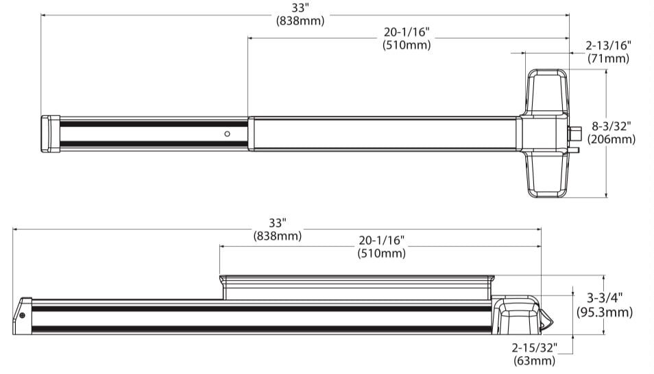 Projections: Pushbar Neutral 3-3/4" (95.3mm), Pushbar Depressed 2-15/16" (74.5mm)